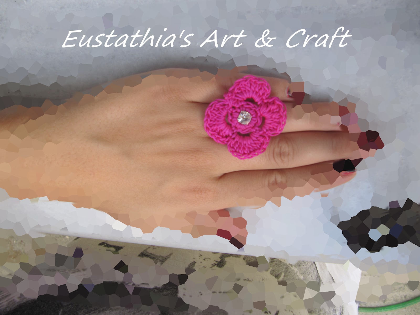 κι εδω εχουμε...........χειροποίητο δαχτυλίδι με βελονάκι σε έντονο μοβ χρώμα με stras στο κέντρο...πάνω σε ασημενιου χρωματος μεταλλική βάση....